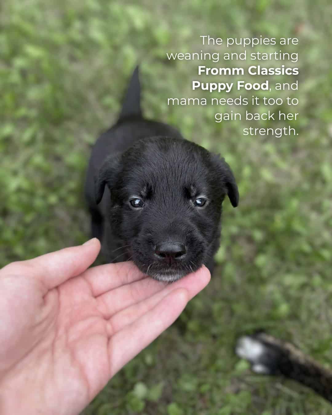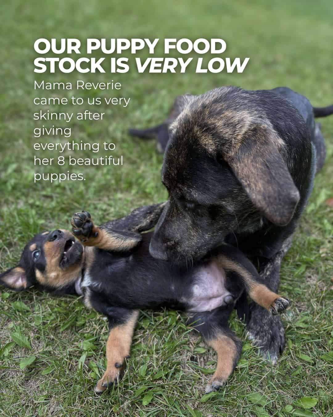 Our stock is almost gone! Can you help mama Reverie and her eight Dreamweaver puppies? She came to us very skinny, pouring everything into her babies. Now she and her pups need Fromm Classics Puppy Food to grow strong. ✨